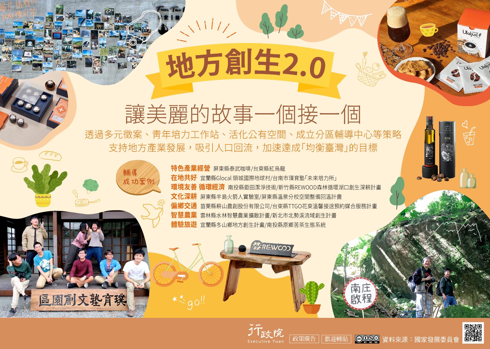 為精進地方創生政策,並切合「前瞻基礎建設計畫」投資未來、加強區域均衡之目標,行政院109年10月再核定「加速推動地方創生計畫」(地方創生2.0),編列5年(110至114年)60億元,自110年起進一步統合跨部會地方創生資源,透過新增多元徵案管道、設置在地青年培力工作站、活化公有空間、成立分區輔導中心及專案辦公室等策略,加大推動力道,以提高整體資源運用效率,朝「均衡臺灣」目標加速前進。