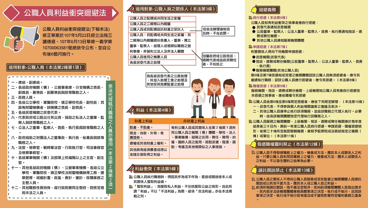 公職人員利益衝突迴避法簡介包含法令適用對象、名詞解釋及迴避情形等重點事項整理。